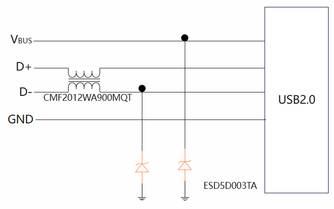 方案一:将原主板位置上ESD更换为单向ESD(ASIM型号:ESD5D003TA),后级电路0电阻更换为共模电感(ASIM型号:CMF2012WA900MQT)。