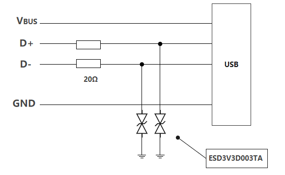 2. 使USB接口电路D+/D-端可以通过静电测试±8KV。