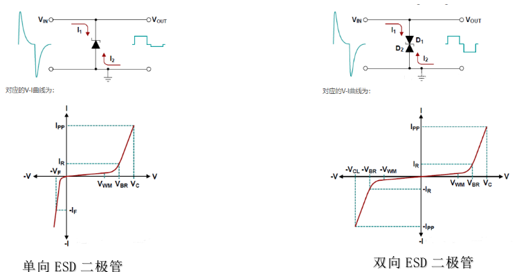 方案一:在测试负压频繁出现损坏,判断测试负压时经过ESD二极管后残压大小影响后极电路,同条件下单向ESD二极管对比双向ESD二极管处于负半周的电压时,有远低于双向ESD二极管导通电压(单向ESD二极管负半周导通电压大概在0.7V),可以更快导通泄放异常高压,以及产生对后极电路影响更小的残压。故在受静电测试负压影响更大的电路里面,选择单向ESD二极管能对电路起更好的防护作用。下图为ESD二极管工作时电性能参数曲线图。